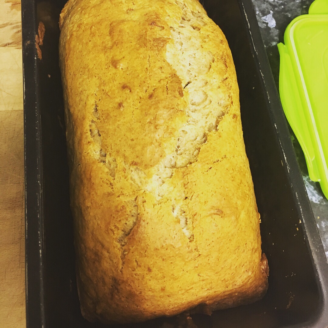 3. Bake in a greased, loaf tin for 20 minutes. Check and if it is browning cover with foil and bake for a further 20 minutes, or until a skewer comes out clean.